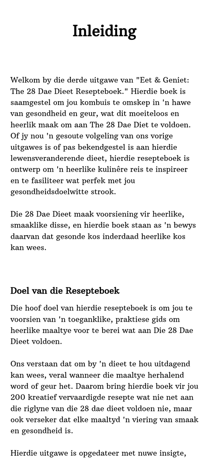 "Die resepte boek maak dit soveel makliker om op die eetplan te bly. Ek het nie idees met kos maak nie...veral nie as ek nie souse ens. mag gebruik nie. Die resepte boek help my om te leer hoe om met kruie kos te maak. Vir die eerte keer was vis in die 28 dae eetplan vir my baie lekker.... Die kos is smaaklik en daar is so baie oulike idees."