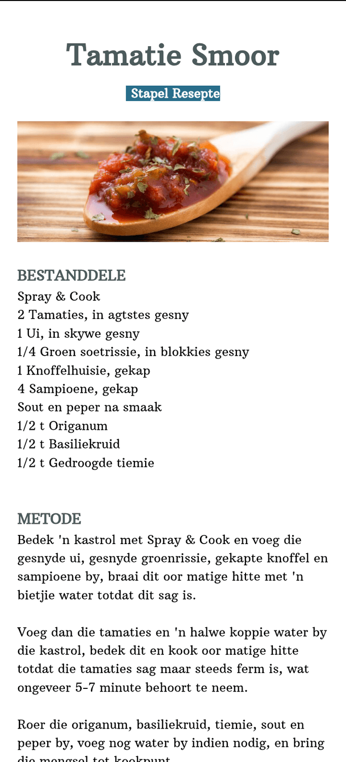 "Die resepteboek is goed saamgestel en verskaf smaaklike resep idees."